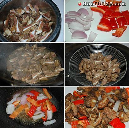 4.锅中留少量油,下入洋葱,红椒块炒至断生,倒入炸好的脆骨翻炒均匀起锅。