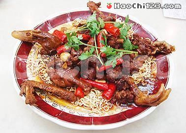 5、把煨制好的鸭子倒在上面,把头、翅膀、脚摆好上桌即可。