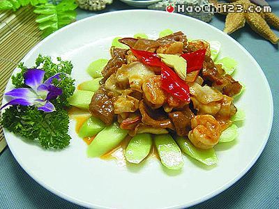 6、锅留油15克,七成热时入XO酱、豆瓣酱小火炒香,下猪肉片、海螺片、虾仁中火翻匀,用鸡粉、剩余的白糖、上汤、胡椒粉调味,用5克生粉勾芡,撒红椒块出锅,装入垫有芥兰片的盘中即可。