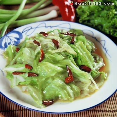 4、锅内放入色拉油,将干辣椒炒至色泽黑红,放入牛心菜片煸炒1分钟,加入少许水、老抽、盐、鸡粉即可。
