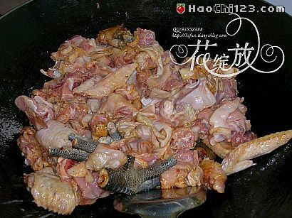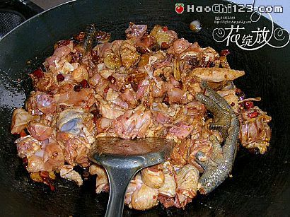 5、下鸡块翻炒约半分钟。