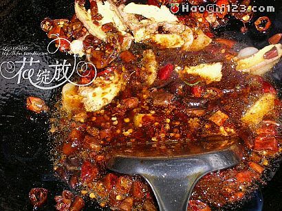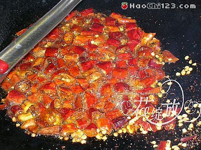 3、将炒锅洗净后置火上烧热,放油烧至五成热,下花椒、干辣椒稍炸。