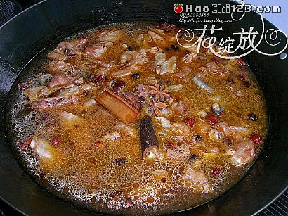 6、加入约三斤汤或水、八角、桂皮,加盖用大火烧沸后改中大火烧约二十分钟(视鸡的老嫩程度为准)。