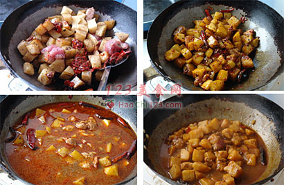 2、香味飘出,红油渗出的时候加入土豆和猪肉,翻炒上色,加水没过土豆,大火烧开,然后转中火烧至汤汁浓郁即可出锅。