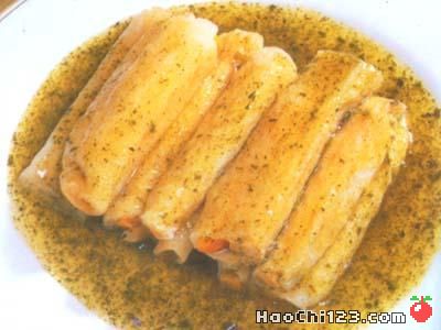 (3) 热锅放油,倒入香椿油爆,加入高汤、味精、盐及淀粉勾芡,淋在竹荪上即可。