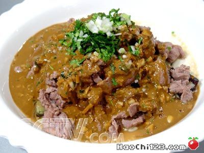 2、坐水,加少许油待水开后放入羊肉片焯熟取出,放在茄子上,取一小碗,加入芝麻酱、醋、姜蒜葱末、香菜、芥末、盐、酱油、鸡精、白糖、香油搅拌均匀浇在菜上即可。