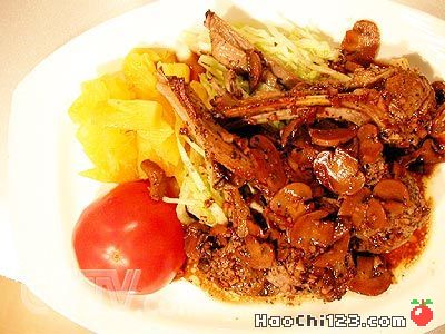 3、坐锅点火倒入橄榄油,将腌好的羊扒放入煎至两面发黄,生熟程度视个人喜好而定,锅上火,放入洋葱末、大蒜末、香草煸炒,加入盐、胡椒、红酒调成汁浇在羊扒上即可。