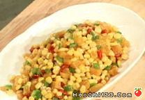 3、留底油,下青椒粒和玉米粒略炒,下红薯丁翻炒,加入高汤、盐、鸡精、胡椒粉至双丁熟后,下枸杞炒匀,勾芡即可。