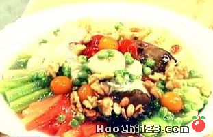 2、坐锅点火放入油,油热按质地不同分别放入锅中煸炒至熟,勾薄芡,出锅前核桃仁末、花生末行、香菜末,点入香油即可。