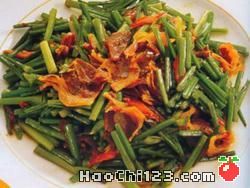 用韭菜100克,去杂质洗净切断,羊肝120克切片,调味品适量,用油大火炒熟食用。
