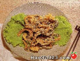4.锅热入油1汤匙,先下姜片爆香,再加入调味料A,再加淀粉水勾芡成浓稠汁滴上香油,再将炸酥香菇条下锅翻炒均匀,最后洒上芝麻起锅盛于盘上,生菜垫底及装饰上桌。