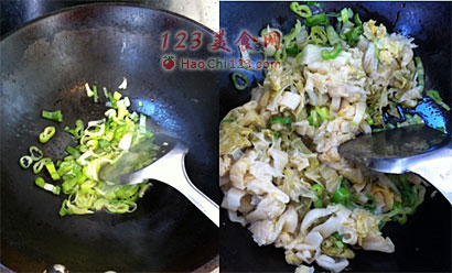2、放入切成丝的酸菜,翻炒几下。
