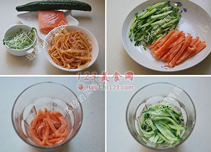 3、取一个空水杯,先在最下面放一层三文鱼丝。