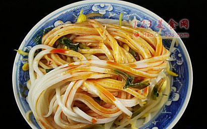 3、秦镇凉皮——以大米粉为原料制成,因产于户县的秦镇,也叫秦镇米皮。制作时把大米粉调节为糊状,平铺在多层竹蒸笼内,旺火蒸熟。吃时,用近一米长、20多厘米宽的大铡刀铡成细丝,加入辅料青菜、小豆芽等,调入佐料,好的口味全在辣椒油上,调好的凉皮全呈红色,辣里香。