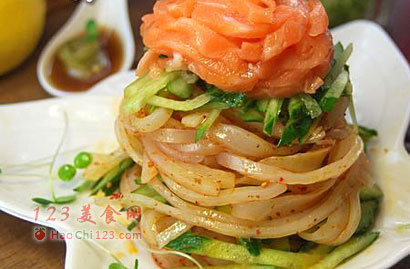4、本菜品是将传统的中式凉皮与日式三文鱼结合,不算是首创吧。很多酒店都有,在万紫千红吃过同样的菜,将三文鱼和凉皮分别切细长条,浇上传统的凉皮调味汁,拌匀即食,没有凹格外新潮的造型,很朴实的外观,口味却特别,除了酸辣适口的本土风味,还略带一点点日式青芥末酱的小清新,令人回味。