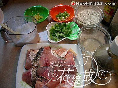 鲜鱼肉半斤、切片、米粉一两、料酒两大匙、酱油两大匙、姜米一咖啡匙、葱花一大匙、香油一大匙、盐适量、香菜一棵切碎、调和油两大匙、汤两大匙。