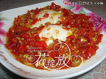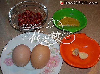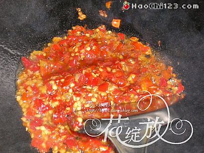 5、锅中放油烧至四成热,下剁椒、蒜、姜、橙碎用小火炒约一分钟。