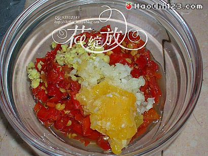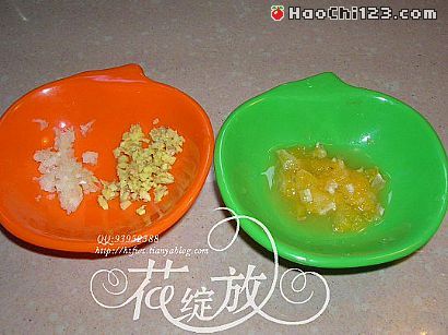 2、将姜、蒜、橙碎放同一个碗里拌匀待作。