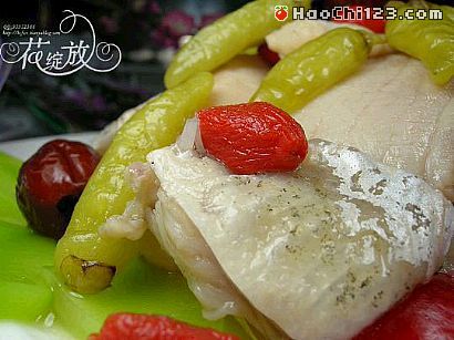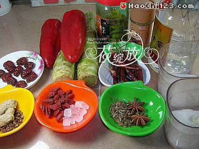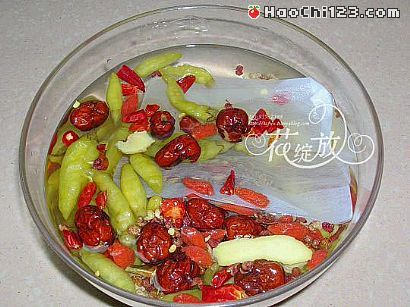 2、将八角、回香装布袋子里封好并与老姜、干辣椒段、花椒、红枣、枸杞、白酒、冰糖、盐、味精、泡椒同放一盆里,加一杯冷开水或纯净水制成卤汁。