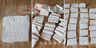 2、将切好的豆腐片如果水分太多最好平放到菜板上晾一会。