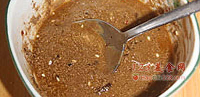 12、然后在蘸料盘中两面沾上花生芝麻孜然混合粉即可开吃了。