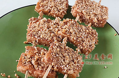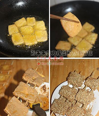 11、将炸好的臭豆腐趁热用筷子夹着穿到2根竹签子上,然后将两面都刷上之前做好的酱料;家里自己吃可以不用竹签子穿,直接炸好了逐块抹酱蘸料放入盘中就可以了。