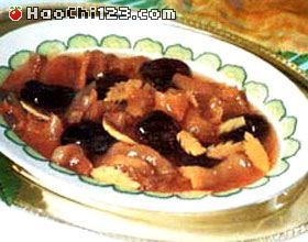 5.食用时,再将猪油烧到六成热时下入白菜苞,加盐炒入味后摆在盘子周围,鱼唇内加入味精和胡椒粉,调好味,用湿淀粉25克(淀粉13克加水12克)调稀勾芡,放葱段和香油,将红煨鱼唇装在菜苞中间即成。