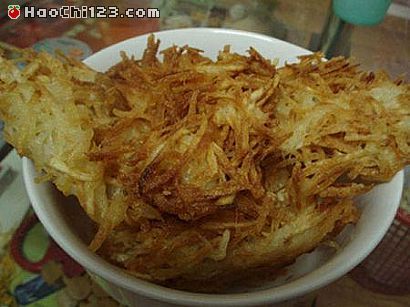 3.将花生油烧沸,用手捏一把上糊的土豆丝(25克左右),再用大拇指按平,手心朝下,下入油锅内,炸成黄色即成螃蟹形,捞出(如此全部炸完)。