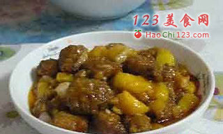 7、然后倒入木瓜块和已经炸过的酥肉,翻炒。