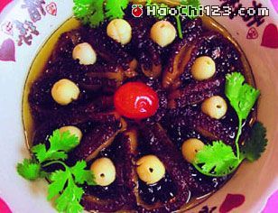 6、放酱油、味精、红酒大火蒸半个小时,嵌入湘莲即成。