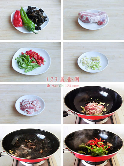 4、将五花肉中的油煸出一部分,至肉片变成微黄色时,倒入木耳、青椒和蒜片翻炒。