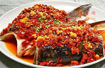 5、取出鱼头,撒葱花,淋热油。这一道香辣味美,鲜嫩细腻,香气浓郁的剁椒鱼头就完成了!要注意的是,调腌制料要到位,否则鱼味发腥。在冬天能吃上一道剁椒鱼头不但暖胃还很暖心吧!