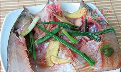 2、周身拍上料酒,葱段、姜片,用盐、酱油抹匀腌制片刻。