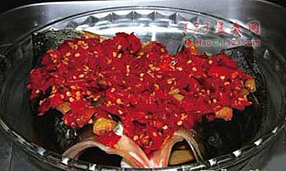 3、盘里码好葱段、姜片,放鱼头,撒姜丝,小米椒末,撒上红油拌剁椒。