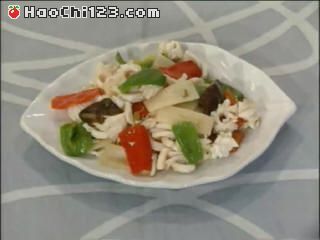 10.余油倒出,炒锅放回炉上,下油,放入葱、笋、香菇、辣椒略炒,加入鱿鱼,烹黄酒,用芡汁勾芡,最后淋油炒匀上碟。