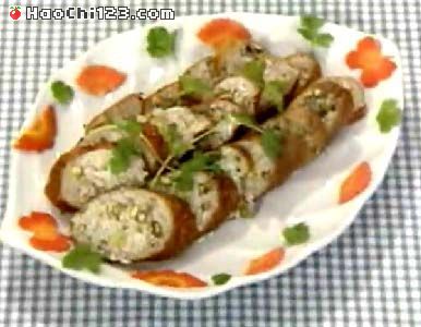猪大肠、400克、绿豆、100克、糯米、125克。2.把绿豆、糯米用精盐、味精拌匀,塞入猪大肠内,随后用绳子把大肠两端扎牢,用手把整条大肠内的馅料捏至均匀;