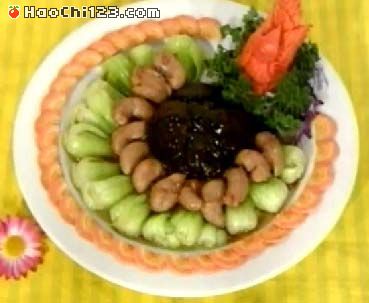 7.将炒锅内放油,烧热后,用旺火将鱼卷泡油至熟,倒在笊篱里,随即下姜丝、蒜茸、油菜,烹黄酒,勾入碗芡,鱼卷一齐炒匀,加油上盘便成。