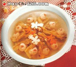 12.用锅洗干净,放上汤1000毫升,加入酱油5克、味精3克、鸭掌丸取出放入大窝,把上汤灌入窝中即可。