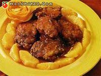 6.将锅端离火口,下入肉脯,再放回火上,开大火烹黄酒,加果汁,淋香油及花生油,炒匀上盘以虾片镶边即成。