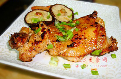 4、平煎锅将腌制好的鸡肉、香菇、胡萝卜,鸡肉肉皮朝下煎至出油,翻面再煎,待两面上色时盛出,香菇、胡萝卜煎熟。