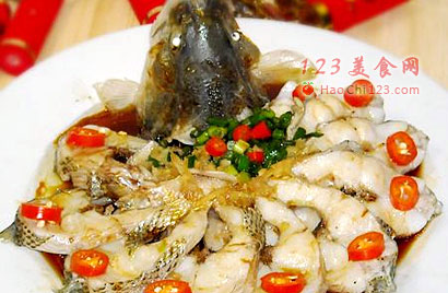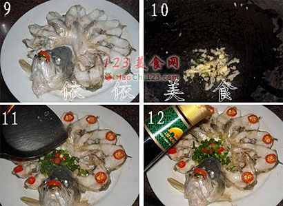 11、在鱼肚和鱼头之间的空隙放上葱花,每片鱼块上摆放一圈红椒,把滚油连姜末一起淋在鱼身上。
