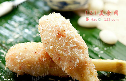 6、做好的甘蔗虾再放入椰丝中,均匀地裹上椰丝备用。