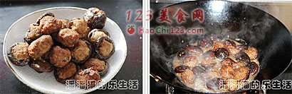 10、到处煎锅中的油,放入新油,用姜末炝锅,爆出香味后下出入煎好的酿冬菇和小肉丸。倒入适量清水没过冬菇,再调入1勺生抽,1勺黄酒、半小勺盐、1小勺糖,中火炖五至六分钟。