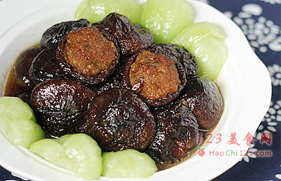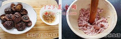 4、建议做这道菜的时候选用干冬菇,泡发后再用。干冬菇有一股芳香气味,是鲜冬菇不具备的。我在调肉馅的时候在里面放了一点海米,这些海米可以起到提鲜的效果,会令这道酿菜别具风味,与众不同。
