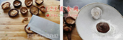 6、把处理好的冬菇背面在干淀粉里蘸一下。这样做可以防止肉馅脱落。