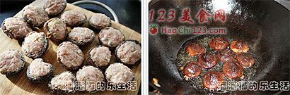 8、将酿好的肉馅的冬菇煎一下。有肉的一面煎一分半钟左右,另一面煎一分钟即可。