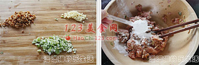 4、把葱姜末和海米碎加入肉馅中,再在里面加入1大勺黄酒、1大勺生抽、2小勺淀粉、半大勺香油、半小勺盐搅拌均匀。