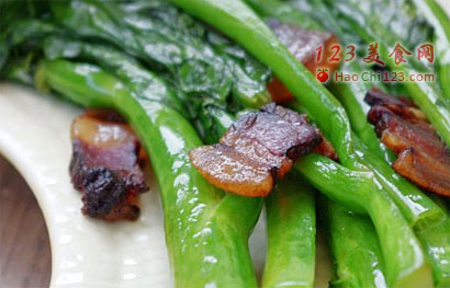芥蓝300g、腊肉50g。2、水沸后加入少许盐。