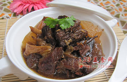 11、牛腩炖好后,放入萝卜,加盖炖上10分钟就可以了。