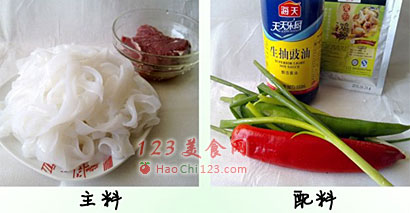 牛肉100g、河粉150、青尖椒1个、红尖椒1个、小葱1根。